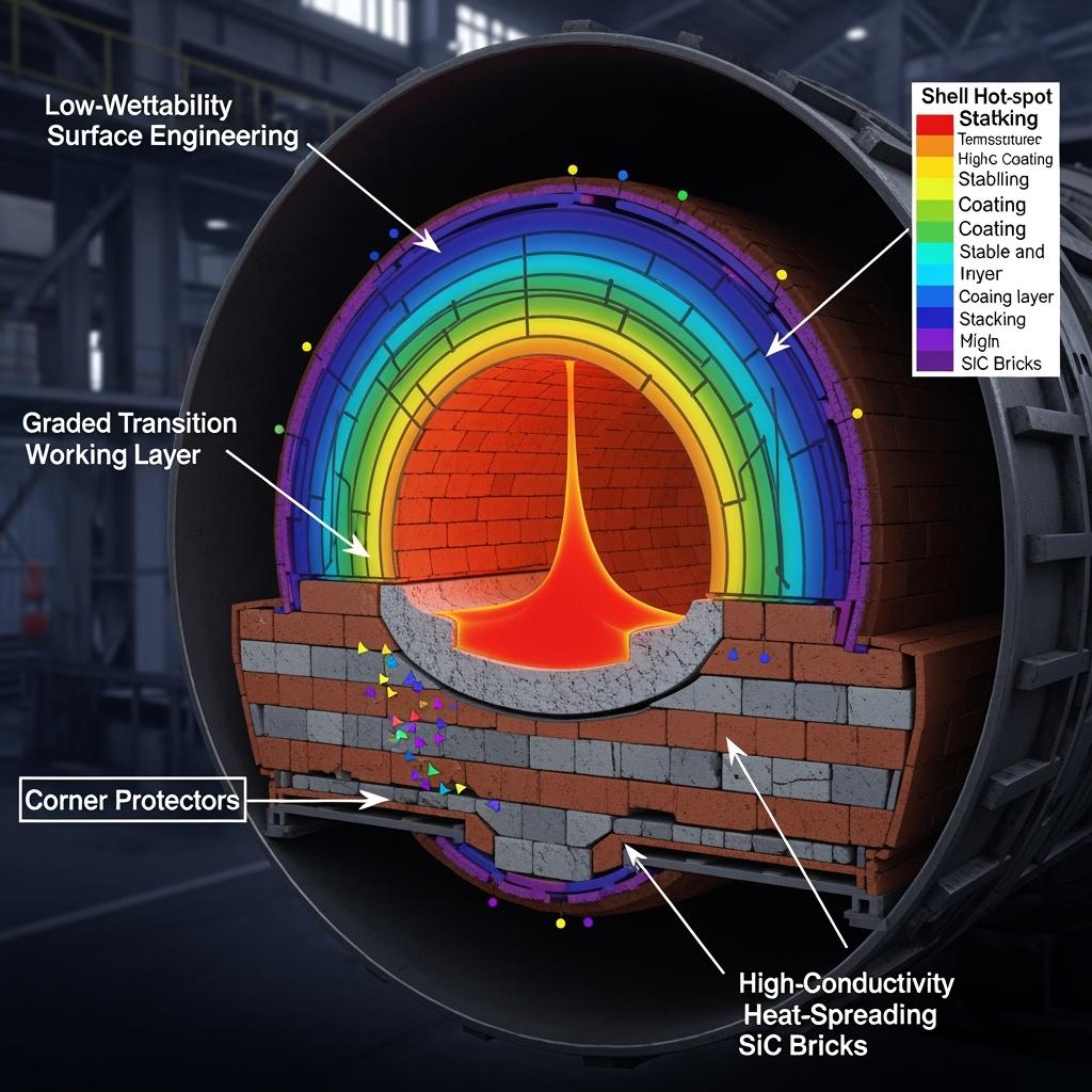 Use high-density SiC composite bricks for the burning-zone working layer, and SiC–mullite functionally graded composites for the transition zone. Add low-wettability, anti-alkali coatings where run-off has been frequent, and apply high-conductivity SiC bricks at hot spots to flatten shell temperature peaks.