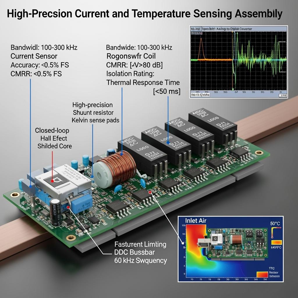 Selecting the right Módulos de Sensado de Corriente y Temperatura de Alta Precisión starts with defining the control loop’s bandwidth and the environment’s harshness. For 750–1000 V DC platforms at 40–100 kHz, prioritize isolated sensing with high CMRR and digital output paths to resist dv/dt‑induced errors. Additionally, place shunts where Kelvin routing is short and shielded, and use Rogowski coils for events your control loop must catch but not necessarily integrate into steady‑state accuracy. Thermal probes should be mounted as close as mechanically safe to the SiC module’s heat flux, and their time constants should feed a controller that distinguishes protective action from steady thermal management.