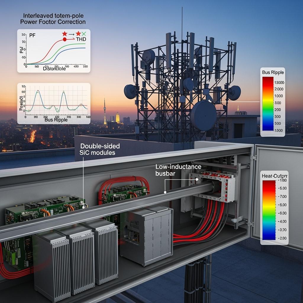 | AC front end | Interleaved totem‑pole PFC at high kHz | Diode/boost PFC at low kHz | Better PF/THD, smaller filters |