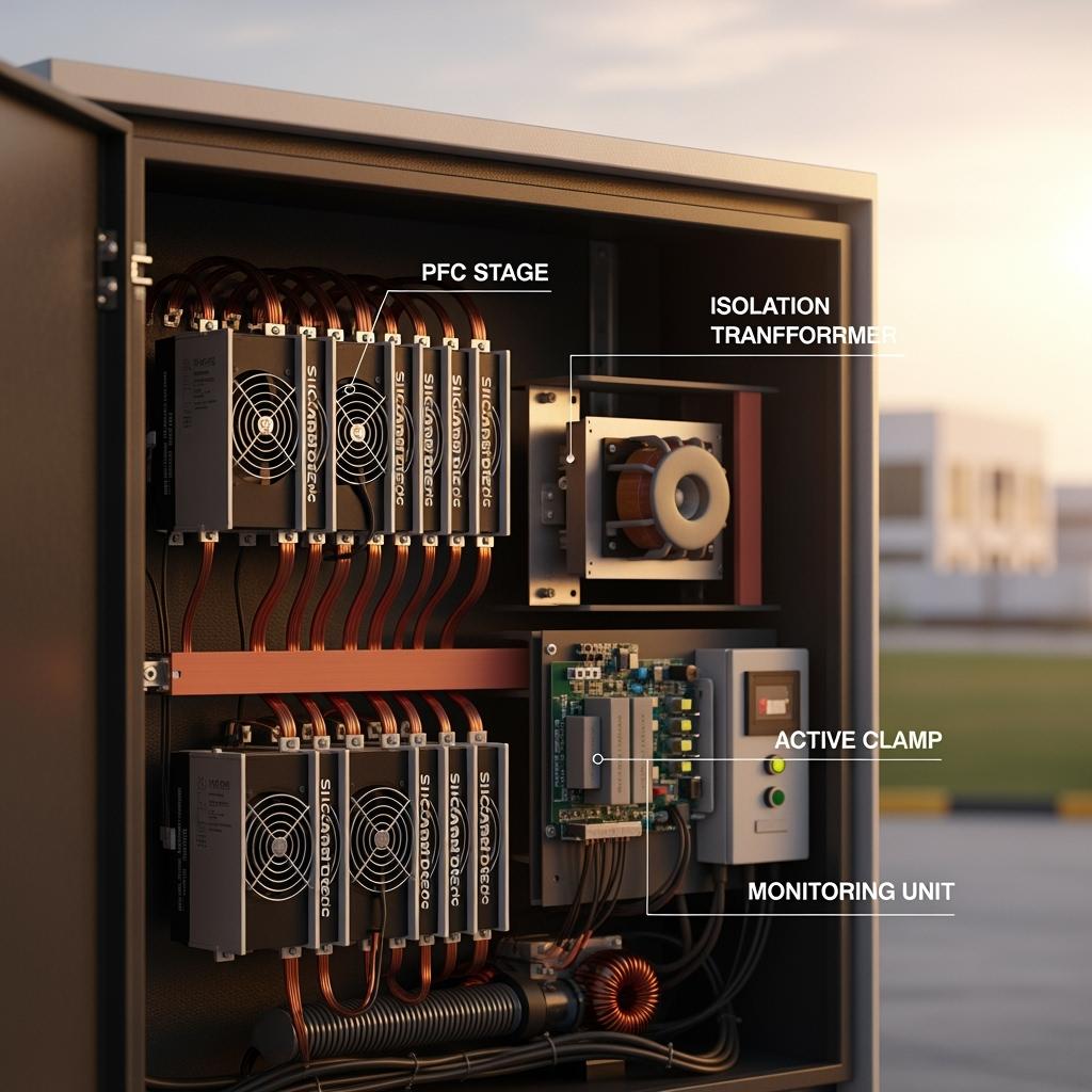 | AC Front-End | SiC totem-pole PFC at 20–50 kHz, PF ≥0.99 | Boost PFC with silicon diodes | Lower THD, fewer feeder trips in peak clusters |