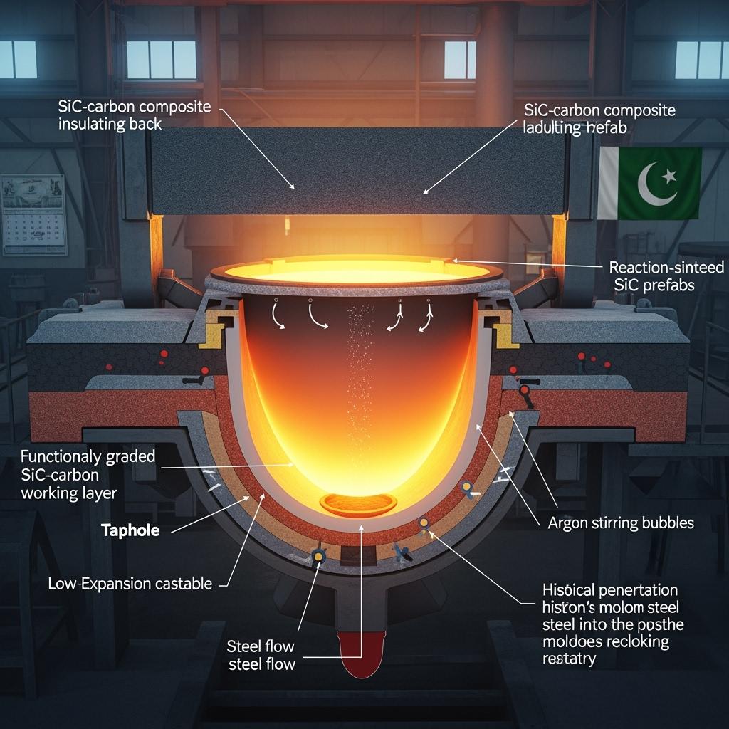 In Pakistan’s ladle and EAF environments—where oxidation, thermal cycling, and variable slags dominate—SiC–carbon’s combination of conductivity, density control, and stabilized carbon phases consistently narrows temperature swings and curbs spalling.