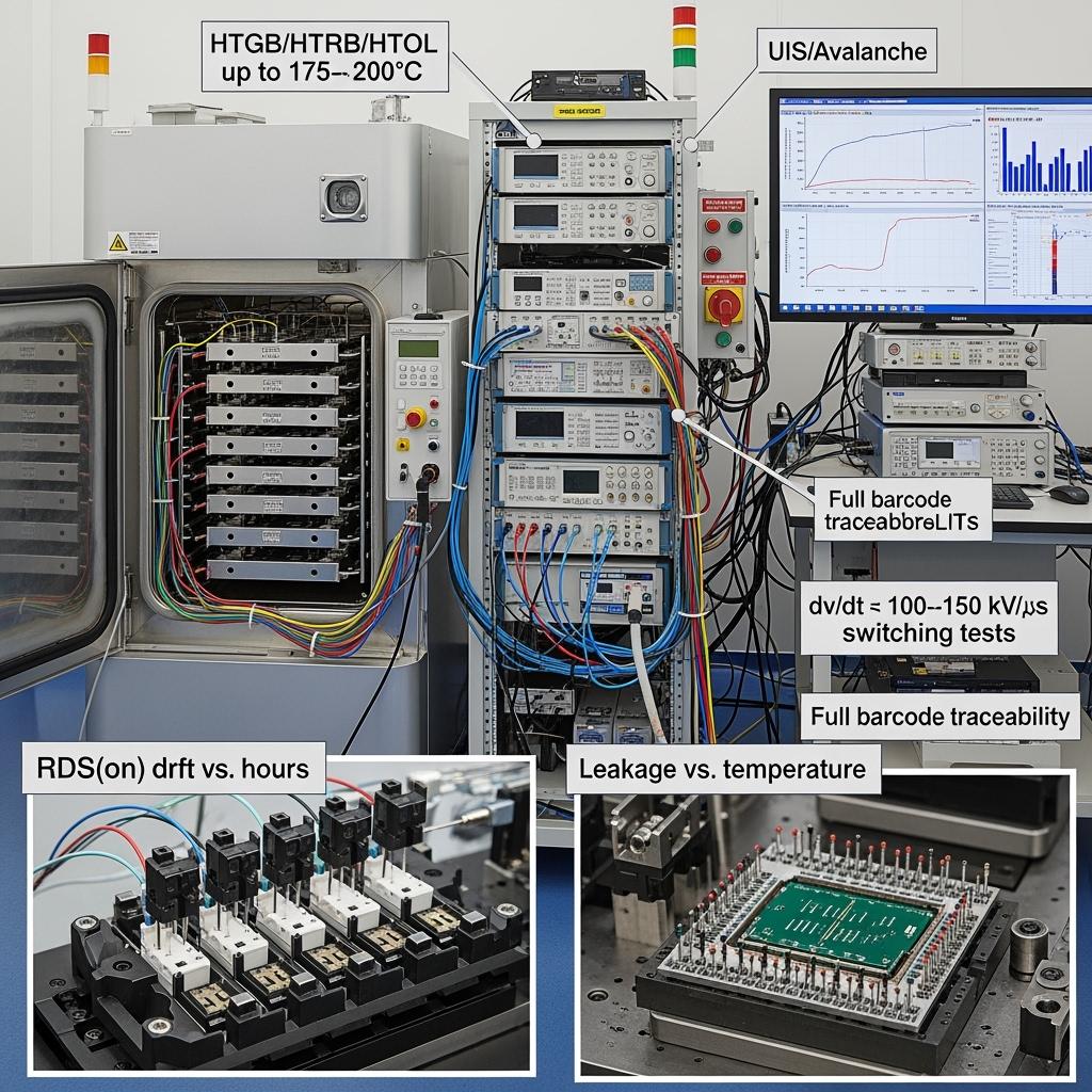 - HTGB (High-Temp Gate Bias), HTRB (High-Temp Reverse Bias), HTOL (High-Temp Operating Life) up to 175–200°C ambient
