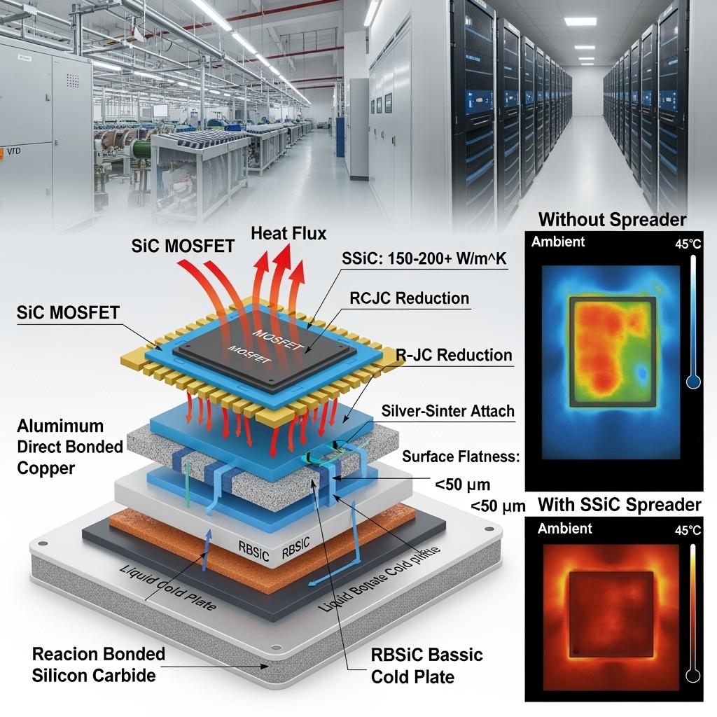 SiC chip-level heat spreader substrates are engineered ceramic components placed directly beneath semiconductor dies or within power module stacks to conduct and laterally spread heat, reducing thermal gradients and peak junction temperatures. Using reaction-bonded SiC (RBSiC), pressureless/solid-state sintered SiC (SSiC), or SiSiC hybrids, these substrates deliver high thermal conductivity, excellent stiffness, and corrosion resistance. For Pakistan’s textile, cement, and steel industries—and expanding data centers—these materials enable higher switching frequencies, higher power density, and longer lifetimes in hot, dusty, and grid-volatile environments.