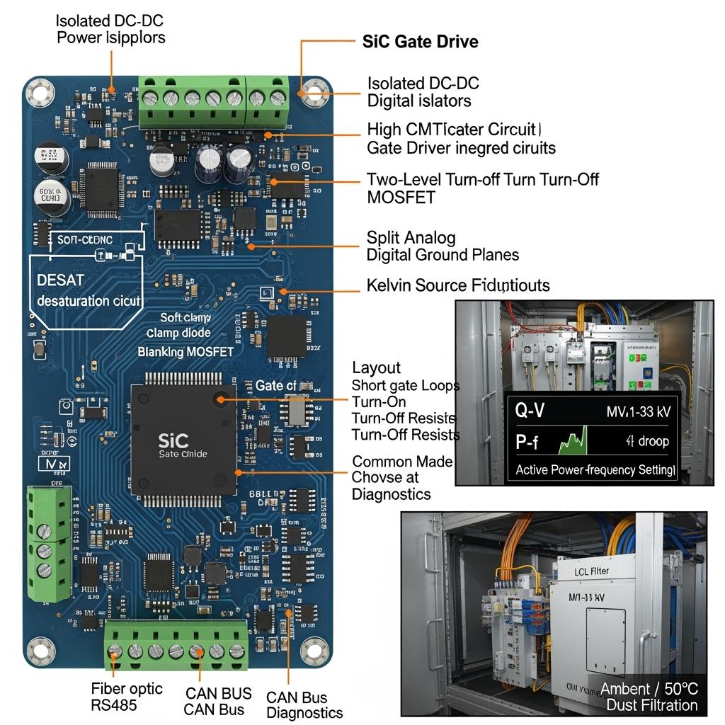 Современные SiC MOSFET переключаются на частоте 50–200 кГц с крутым dv/dt. Драйвер затвора должен обеспечивать точное управление зарядом затвора, надежную изоляцию и скоординированную защиту. Индивидуальные платы управления затвором SiC от Sicarb Tech интегрируют: