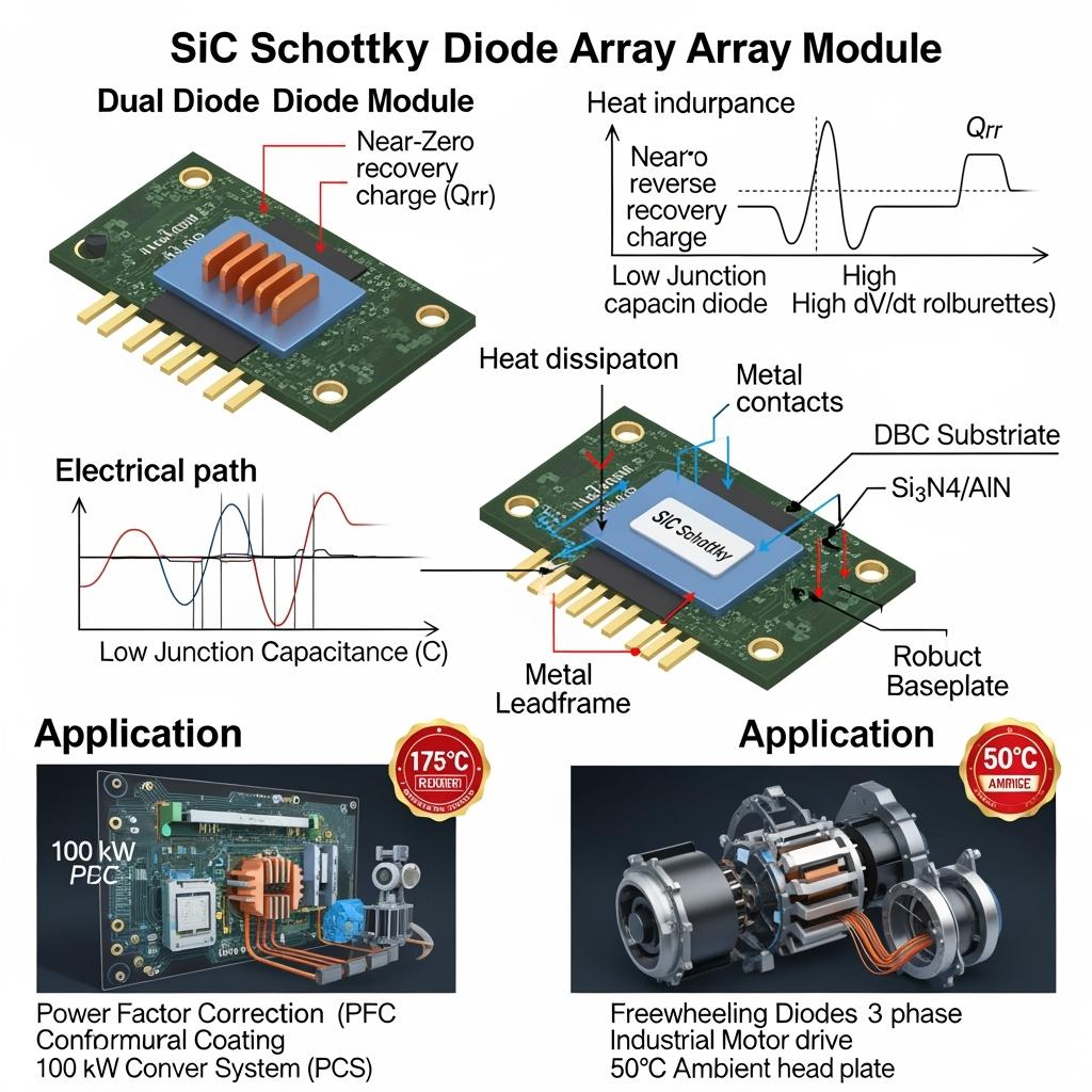 Массивы диодов Шоттки из карбида кремния разработаны для сверхбыстрого, низкопотерьного выпрямления и свободного хода в коррекции коэффициента мощности (PFC), DC/DC, а также в инверторных плечах промышленных приводов и систем преобразования энергии (PCS) систем накопления энергии (BESS). В отличие от ультрабыстрых кремниевых или SiC PN-переходных диодов, структуры SiC Schottky демонстрируют пренебрежимо малый заряд обратного восстановления (Qrr) и низкую емкость перехода (Cj), что обеспечивает высокочастотную работу (50–200 кГц) со сниженными потерями при переключении и электромагнитными помехами (EMI). В конфигурациях массивов — двойные с общим катодом, с общим анодом и полномостовые сборки — они обеспечивают масштабируемую обработку тока, компактные размеры и упрощенное управление тепловым режимом.