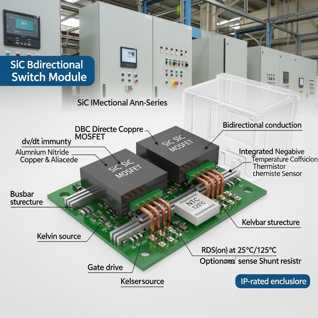 Silicon carbide (SiC) bidirectional switch modules combine two high-performance MOSFETs or JFETs in anti-series (or a monolithic bi-directional structure) to conduct and block in both polarities, enabling zero-cross high-speed switching for AC loads without mechanical contacts. Compared with triacs/SCRs and mechanical relays, SiC bidirectional switches deliver ultra-fast turn-on/off, low conduction losses, excellent thermal headroom, and near-silent operation—ideal for solid-state relays (SSRs), AC matrix converters, soft starters, static transfer switches, and smart breakers.