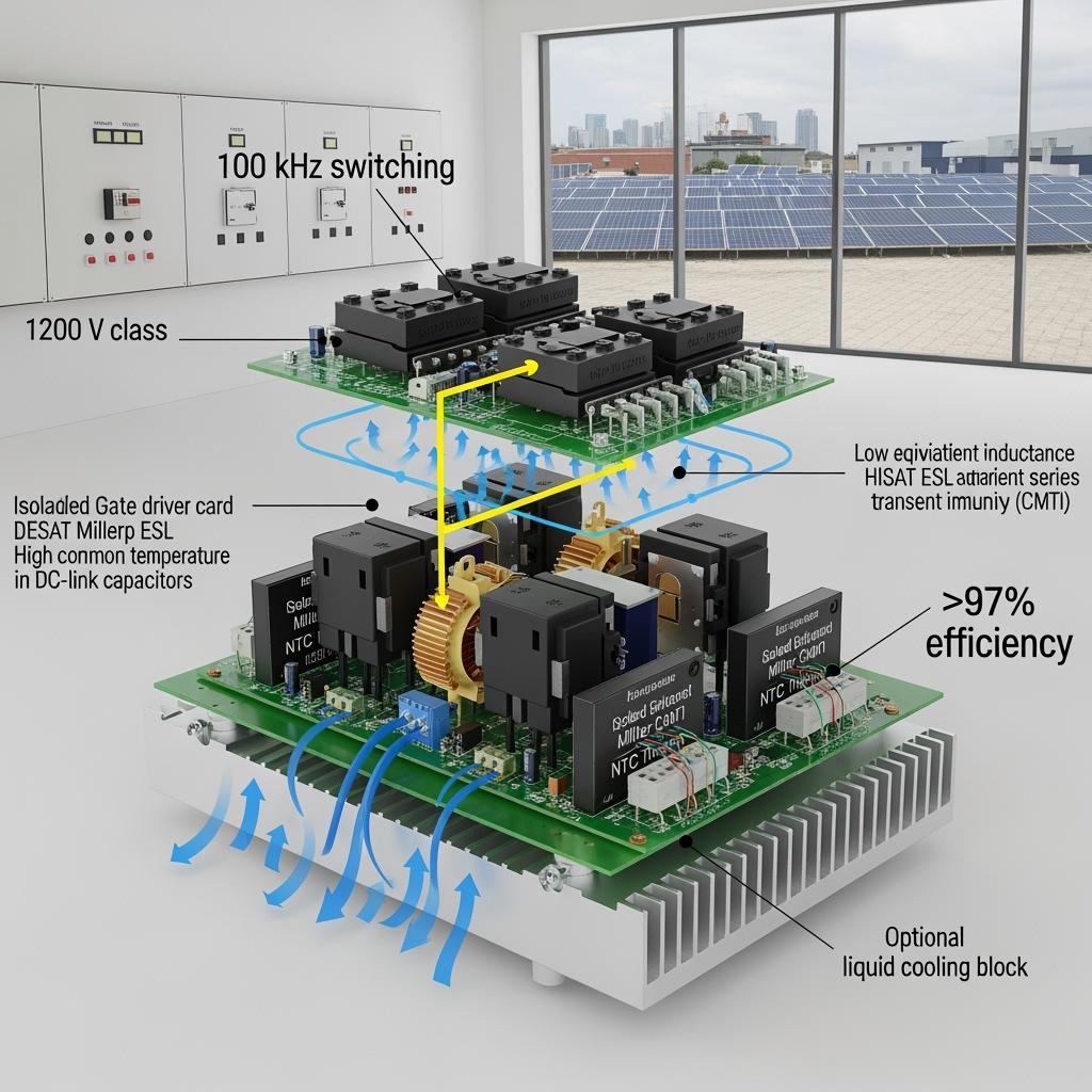 - Gate drive: ±15–18 V, DESAT protection, soft turn-off, Miller clamp, CMTI >100 V/ns