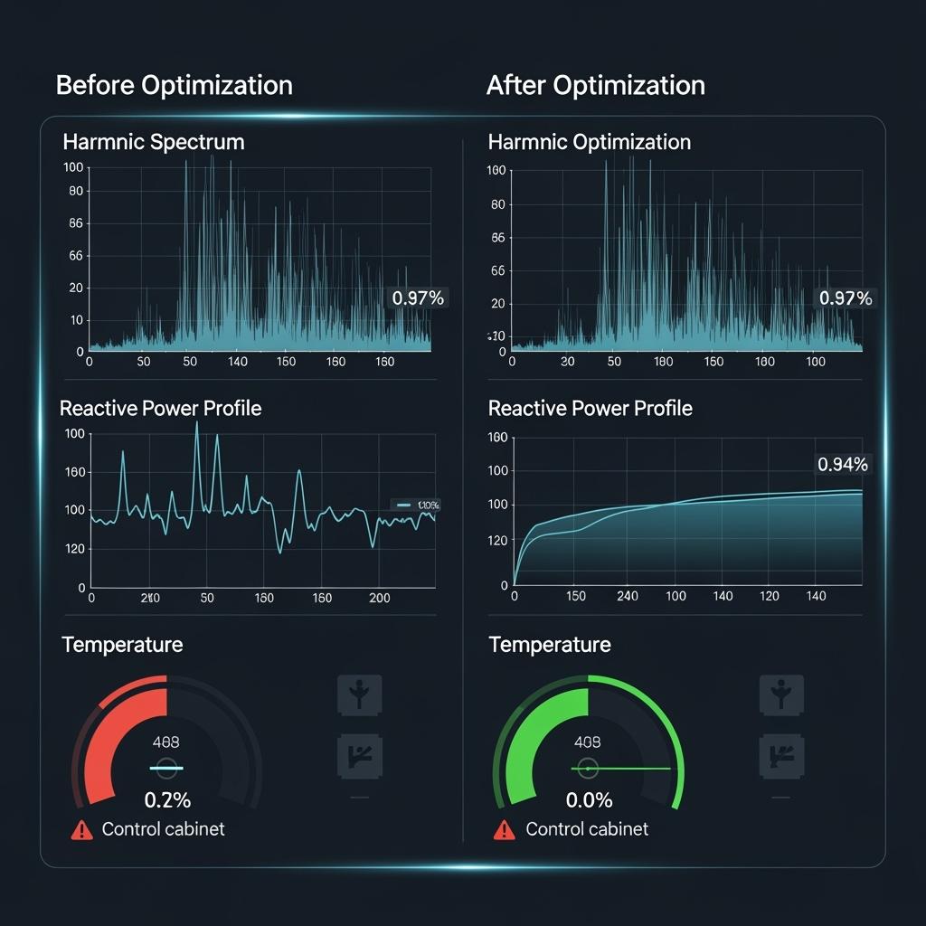 - Impact: THD reduced below IEEE 519 limits; 4.8% energy savings; maintenance interval extended by 30%.