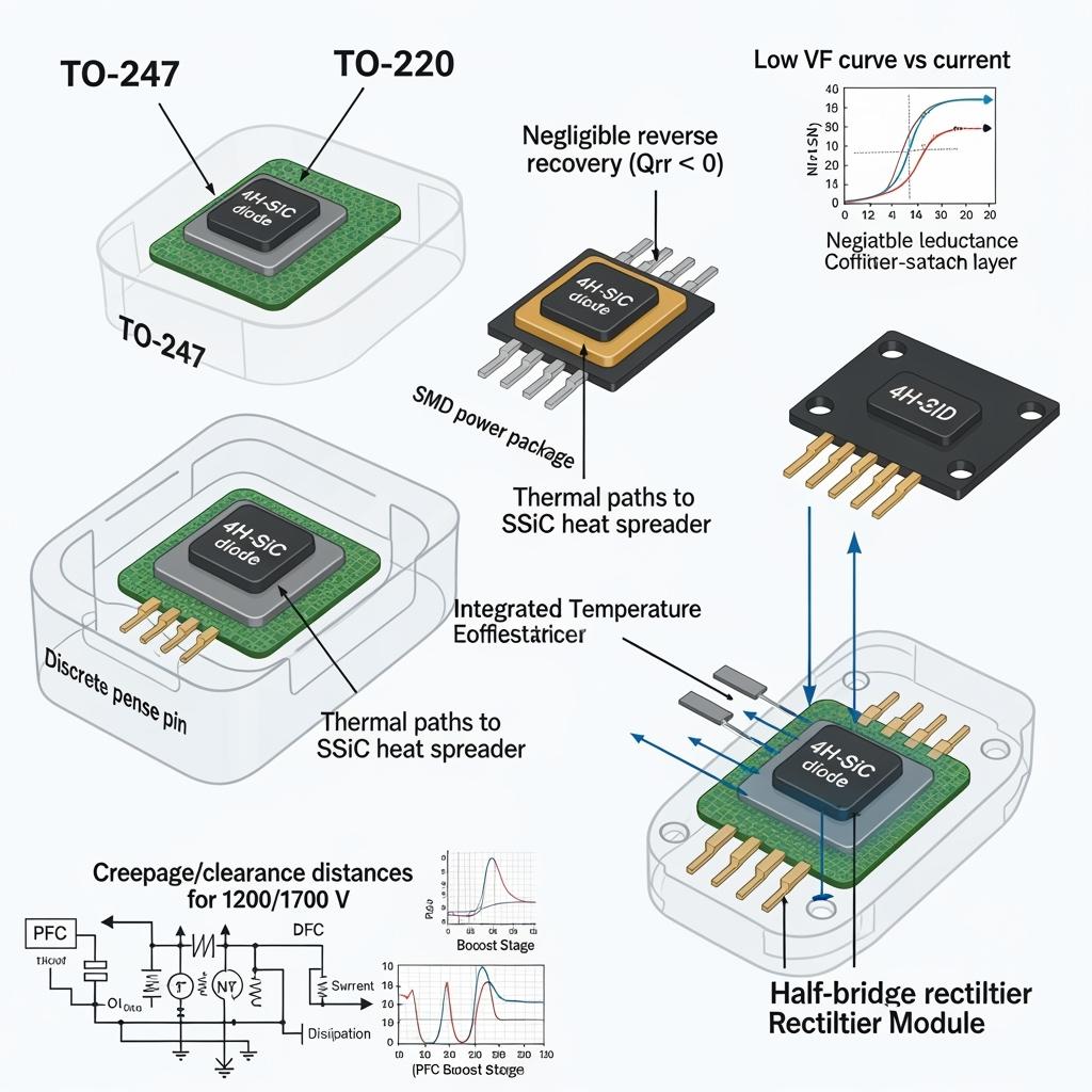 - Lower-VF next-gen SiC SBDs: Barrier engineering to reduce forward losses while maintaining low leakage.