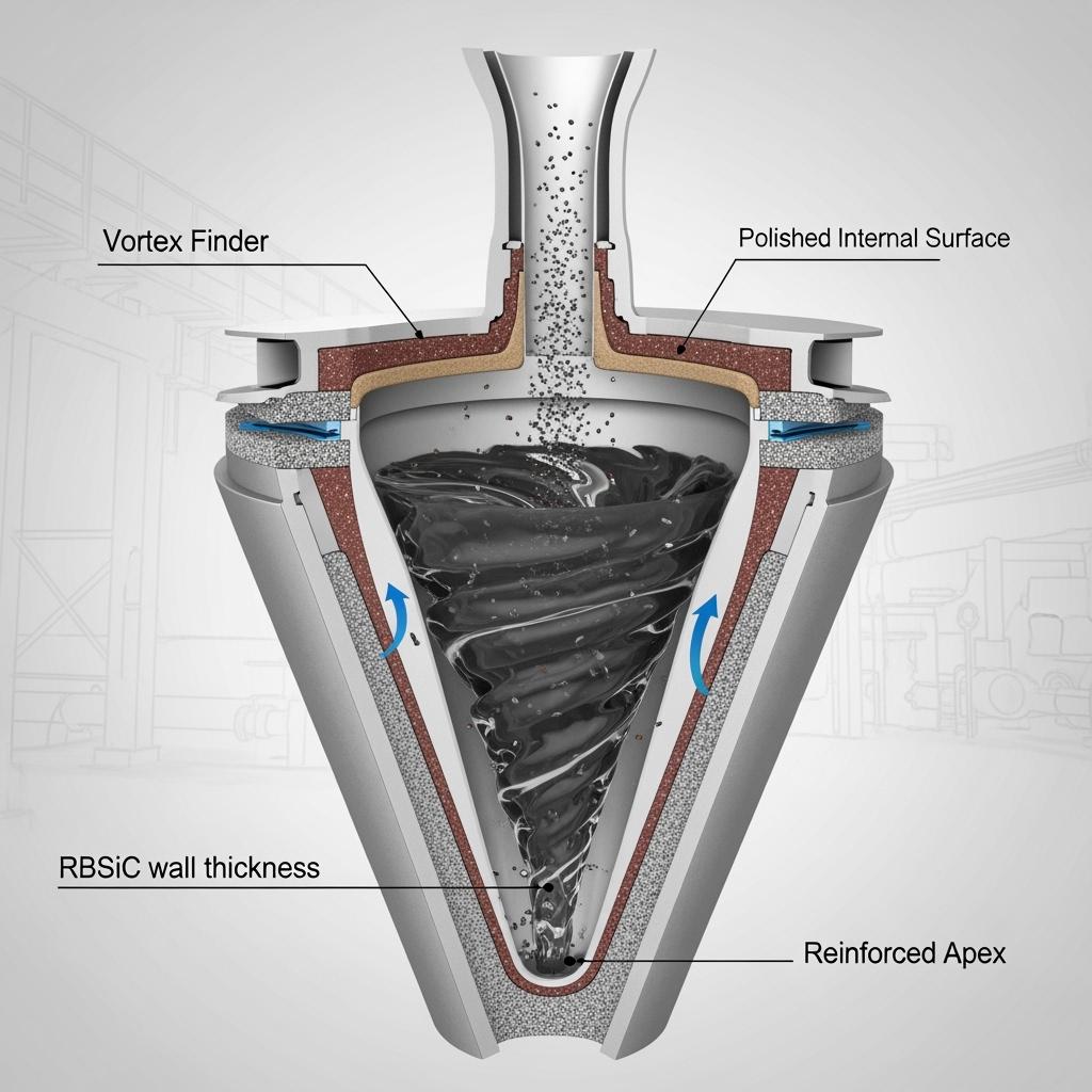 | Iron ore and bauxite hydrocyclones | Erosion, turbulence | RBSiC / SiSiC | Inlet reprofile, apex reinforcement | 2× wear life, tighter cut size |