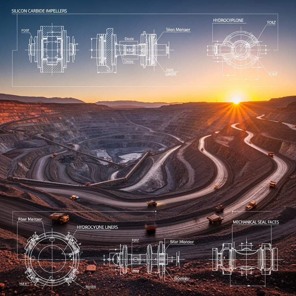 Slurry pump impellers and volute insertsSiSiC or RBSiCHigh hardness; design flexibility2–3× MTBF; lower vibration; energy stability