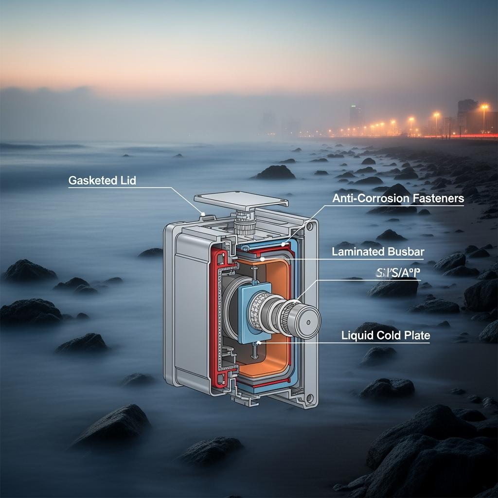 We combine sealed housings with gasketed lids, moisture‑resistant encapsulants, anti‑corrosion coatings, and protected fasteners. Laminated busbars and optimized creepage preserve insulation, while corrosion‑resistant cold plates resist scaling and pitting.