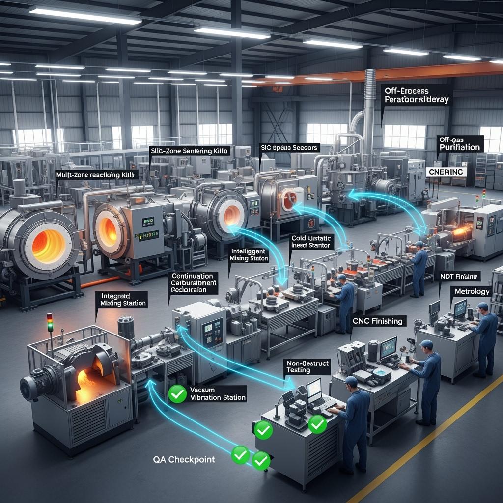 Modularization allows staged capex: begin with mixing, forming, and one reaction-sintering kiln; add continuous carburation, vacuum/inert heat treatment, and expanded QA as volumes and SKUs grow. This phased approach aligns cash flow with market capture.