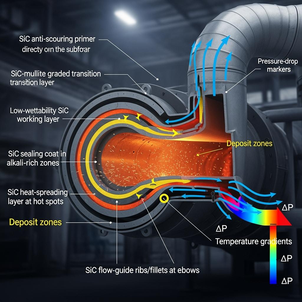 Start with the low-wettability SiC working layer over a high-density anti-scouring primer and a functionally graded transition. Add an SiC sealing coat where alkali–sulfur–chlorine volatility is highest, and deploy SiC heat-spreading equalizers at hot spots. Use SiC flow ribs/fillets in elbows and contractions, and fast-curing SiC gunning compounds for in-shift repairs.
