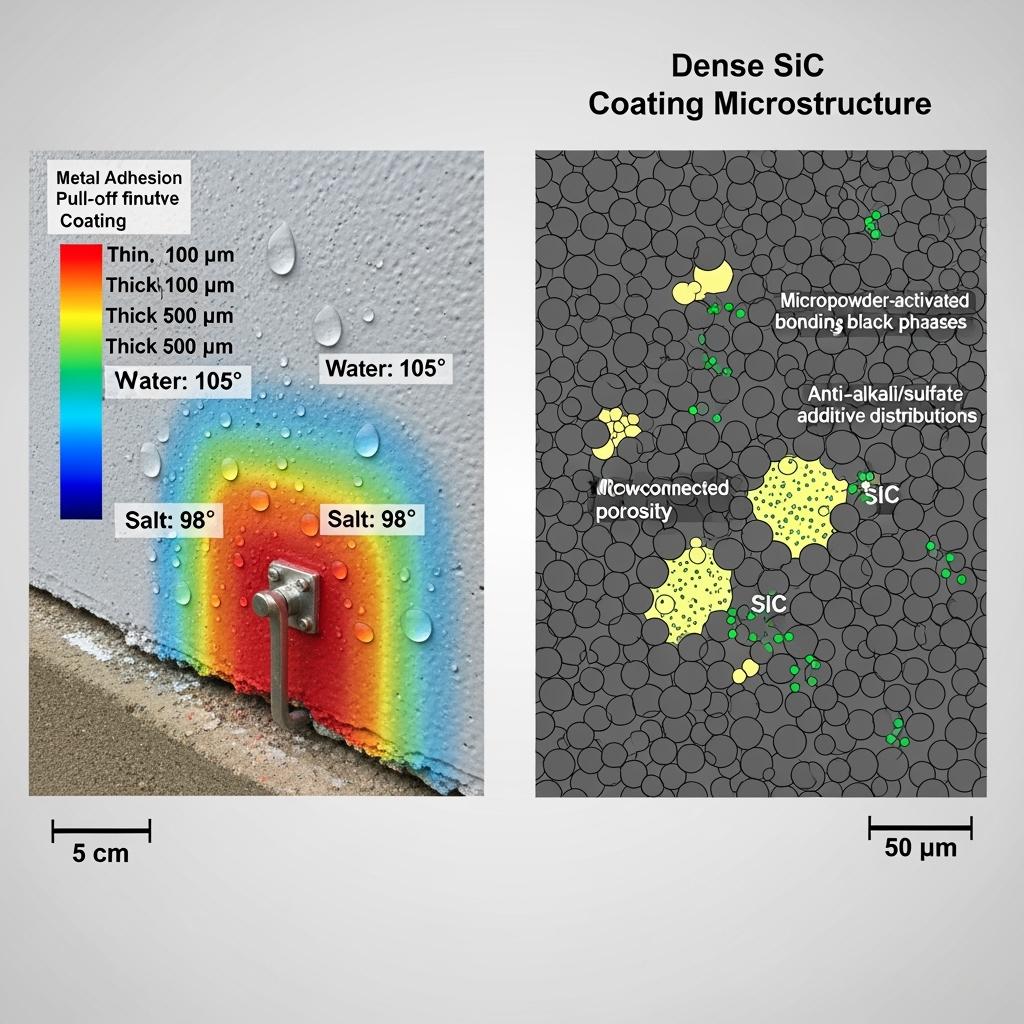 Underpinning microstructure is a multi-graded SiC aggregate package calibrated for coating density and pore size, paired with a micropowder activation and anti-oxidation additive system that lifts post-firing density and oxidation resistance. Where salt attack is severe, anti-alkali-metal and sulfate composite additives suppress reaction pathways. SiC wear-resistant expansion-joint strips and flexible shims absorb deformation and protect interfaces from thermal mismatch. Application reliability is scaled by modular spraying equipment and feed systems that stabilize flow and thickness in the field, and by an online NDT and surface-energy testing suite that confirms adhesion, thickness, and contact-angle windows during and after installation.