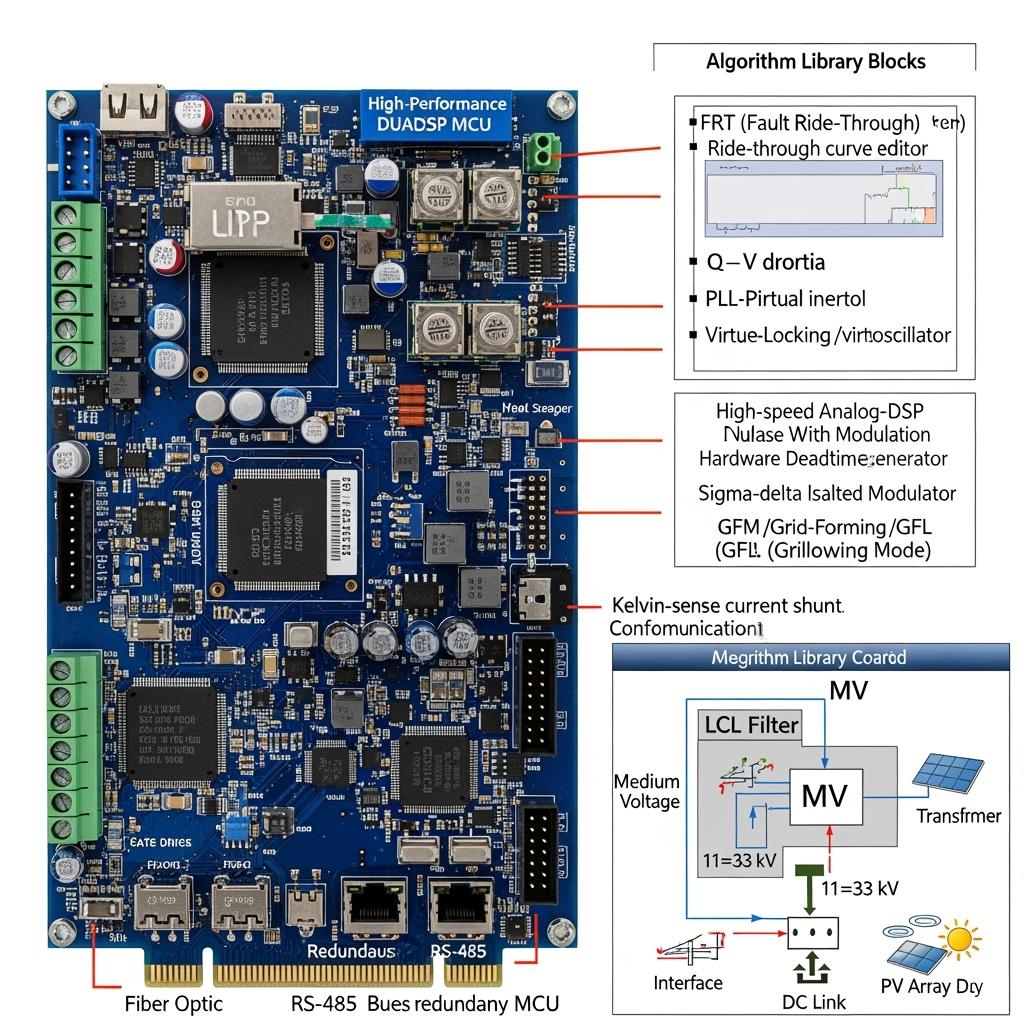 2025'te pazar, düşük THD ve azaltılmış soğutma ayak izleri için optimize edilmiş LCL filtrelerle 50–150 kHz anahtarlama frekanslarında çalışan kompakt, yüksek verimli SiC invertörler talep ediyor. SiC'ye özgü kontrol, PWM ölü zamanını, dv/dt kısıtlamalarını ve kapı sürücü telemetrisini koordine ederek daha hızlı cihaz dinamiklerine uyum sağlar. Gömülü FRT profilleri, orta gerilim bağlantı kurallarıyla uyumlu olarak, gerilim düşüşleri sırasında senkronizasyonu korurken, reaktif güç desteği besleyici gerilim kararlılığını güçlendirir. Entegre siber güvenlik, uzaktan teşhis ve durum izleme ile bu kontrol kartları, devreye almayı kısaltır, ≥,5 sistem verimliliği sağlar ve 2 kata kadar güç yoğunluğu ve 200.000 saatlik MTBF hedeflerine ulaşmaya yardımcı olur.