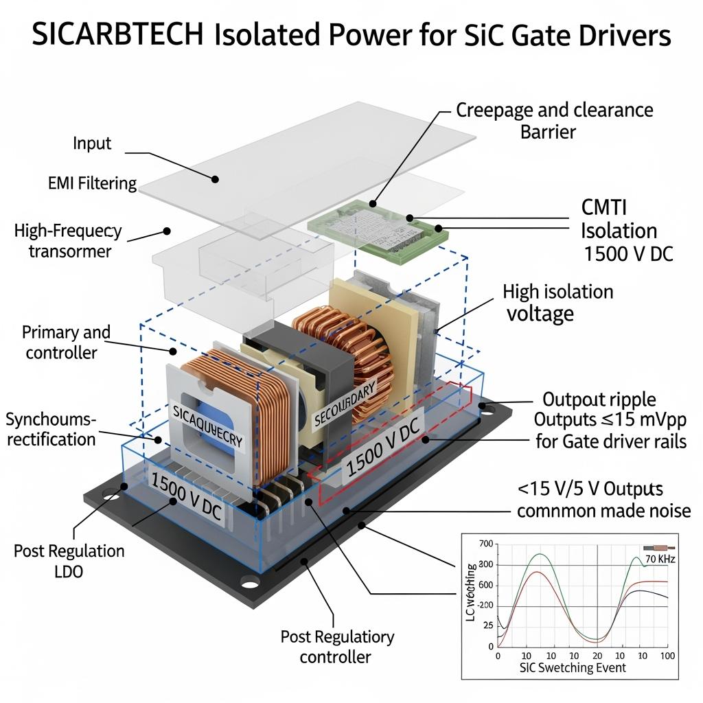 1500 V DC Platformlar için Düşük Gürültülü ve Yüksek İzolasyon Gerilimli SiC Sürücü Modüllerinin merkezinde, güçlendirilmiş izolasyon sistemleri ve dikkatle yönetilen sargılar arası kapasitans ile üretilmiş yüksek frekanslı bir transformatör yer alır. Sicarbtech, hızlı dv/dt kenarlarının 1200 V ve 1700 V SiC MOSFET'lerden sürücü beslemesine gürültü enjekte etmemesi için manyetik yığını ortak mod bağlantısını en aza indirecek şekilde tasarlar. Senkronize doğrultma ve düşük ESR çıkış ağları, darbeli kapı akımı talepleri altında sıkı düzenleme sağlarken, isteğe bağlı post-regülasyon doğrusal kademeler, ortam sıcaklıkları 50°C'yi geçtiğinde bile dalgalanmayı düşük milivolt aralığında tutar.