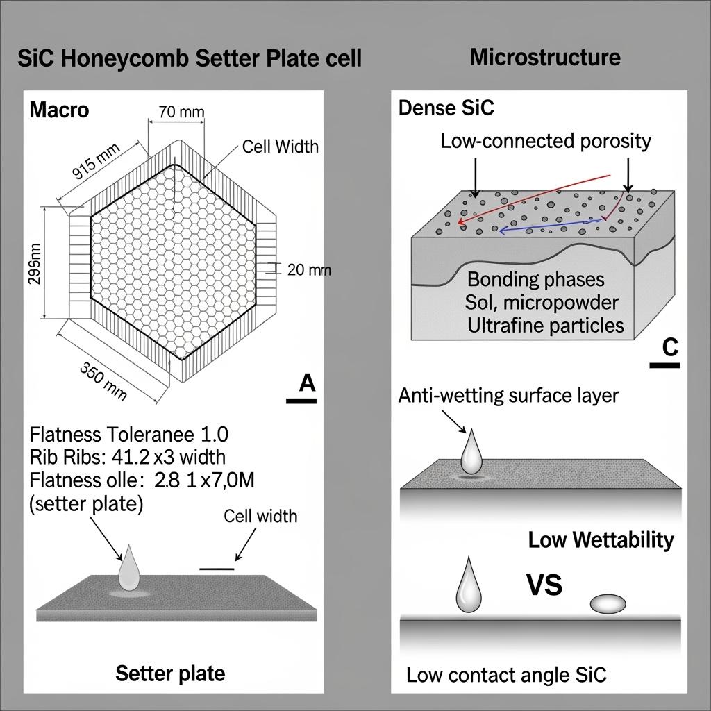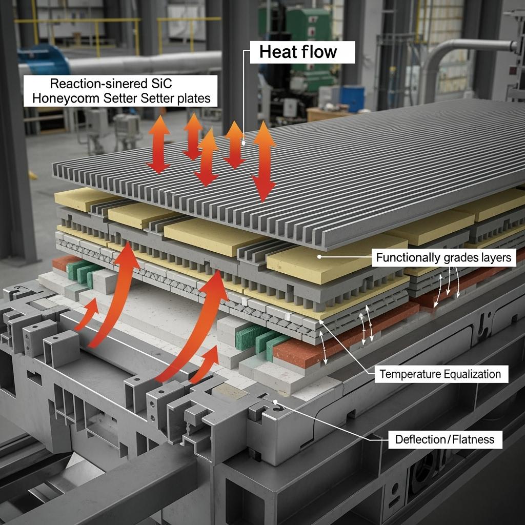 Start with reaction-sintered SiC honeycomb setter plates to cut mass and heat capacity, and migrate kiln car top decks to SiC honeycomb to slash the heat budget. For large bodies, use high-density thin-rib plates with functionally graded layers to stabilize flatness. Add low-wettability coatings where sticking is recurrent.