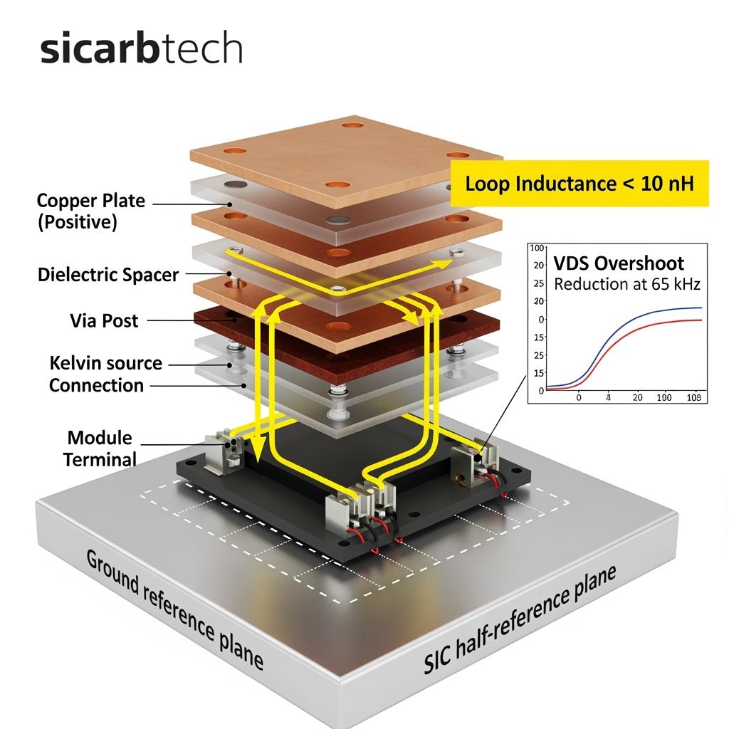 SiC Modül Aşırı Gerilim Bastırma ve EMI Kontrolü için Düşük Endüktanslı Yığın DC Barası ve Kurşun Çerçeve Yapılarının kalbinde, kontrollü kalınlıkta dielektriklerle ayrılmış, sıkıca birleştirilmiş pozitif-negatif iletken çifti bulunur. Lamine veya yığınlanmış düzlemlerde zıt akım yollarını üst üste bindirerek, manyetik alanlar birbirini götürür ve döngü endüktansını, genellikle 10 nH'nin altına, anahtarlama davranışını önemli ölçüde değiştiren seviyelere çeker. Sicarbtech, bu düzlemleri kısa, geniş bağlantılarla doğrudan modül DC terminallerine bağlarken, güç akımı dinamiklerinin gate sinyallerini kirletmesini önlemek için gate sürücüsü için ayrı Kelvin kaynak yolları ayırır.