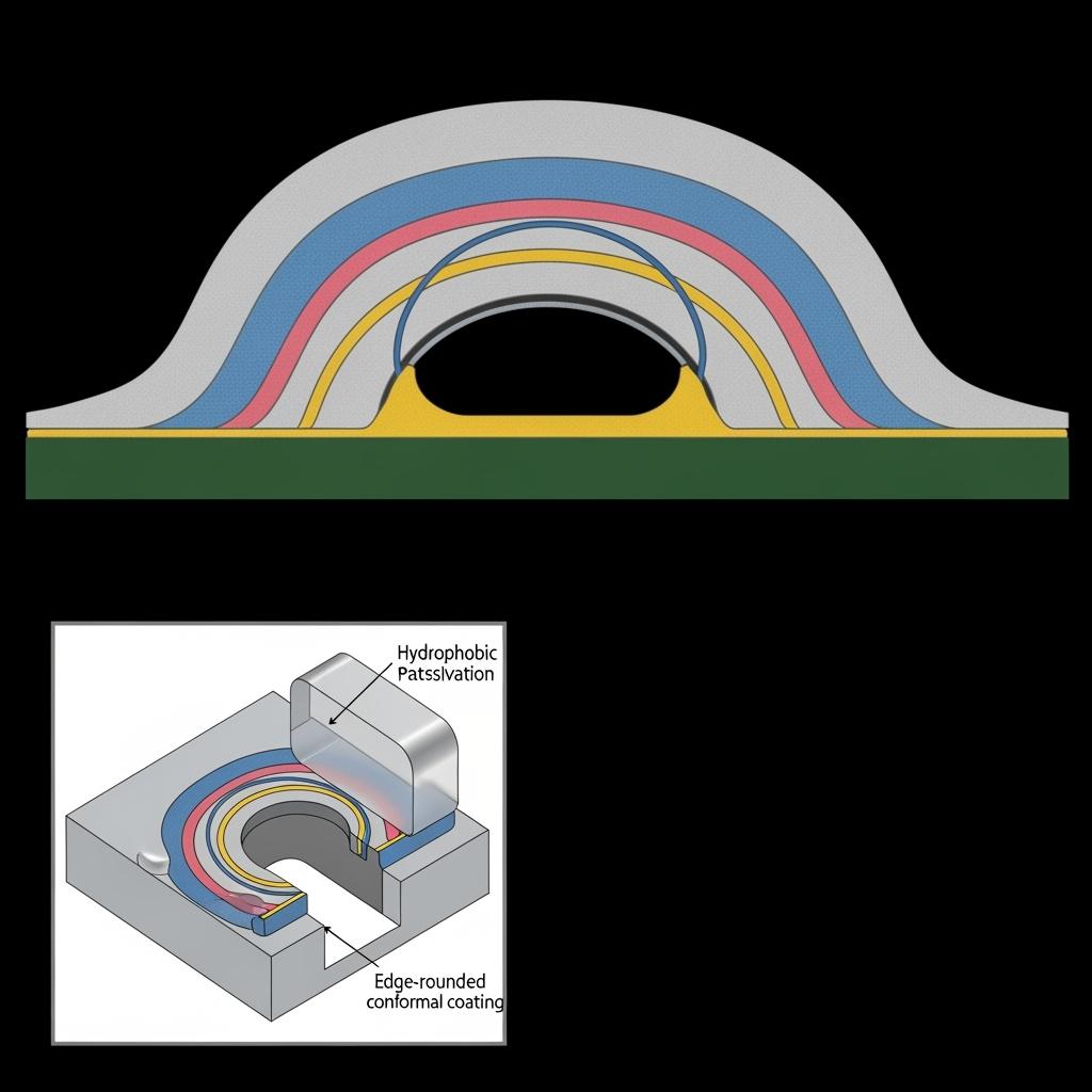 | Dielektrik yığını | Birincil pasivasyon + jel + hidrofobik üst kat | Tek vernik veya hiçbiri |