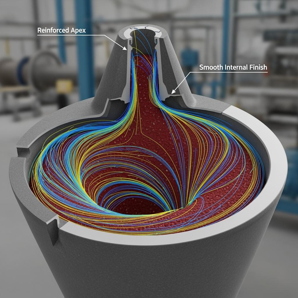 RBSiC/SiSiC is typically optimal due to thermal shock tolerance and formability for complex, reinforced geometries. CFD-led inlet and apex reprofile ensure even wear and stable classification.