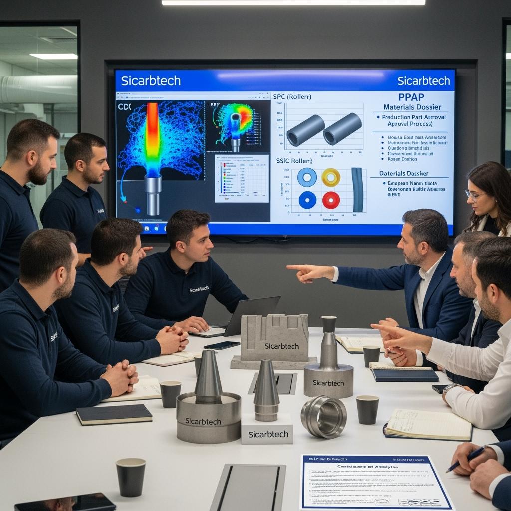 Moreover, hybrid component architectures—SSiC at wear and precision points combined with SiSiC or RBSiC bodies—are expanding, striking the right balance of cost and life. Digital twins for burners, rollers, and fixtures will become standard, enabling teams to tune flow and heat distribution before the first firing. As an EU ceramics and thermal systems brief framed it, “Procurement is moving from part price to system efficiency and evidence-backed reliability.” (Source: Public industry roadmap summaries, 2024). Sicarbtech’s engineering rigor and localization capability are aligned with this shift.