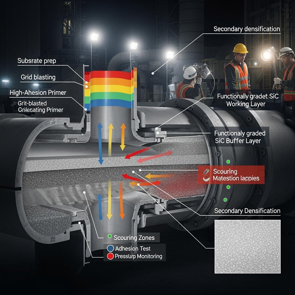 Sicarbtech’s portfolio is designed as a layered system that restores function and extends life without a full tear-out. The general-repair SiC composite spray forms the workhorse for crack sealing, scoured surface build-up, and microspall consolidation. Where velocities and dust loading are severe—throats, elbows, cones—a high anti-scouring SiC spray with a hard, fine-grain working layer arrests grooving and protects geometry. In oxidizing, sulfur–alkali-rich flue paths, specialized oxidation- and alkali-resistant SiC coatings slow mass loss and chalking. For outages measured in hours, fast-curing systems return assets to service quickly, while fiber-toughened variants resist crack propagation across thermal cycles. A functionally graded layered approach—buffer layer for compliance, high-hardness working layer for wear, and low-wettability top layer for fouling resistance—aligns toughness, hardness, and surface behavior with local stress and chemistry.