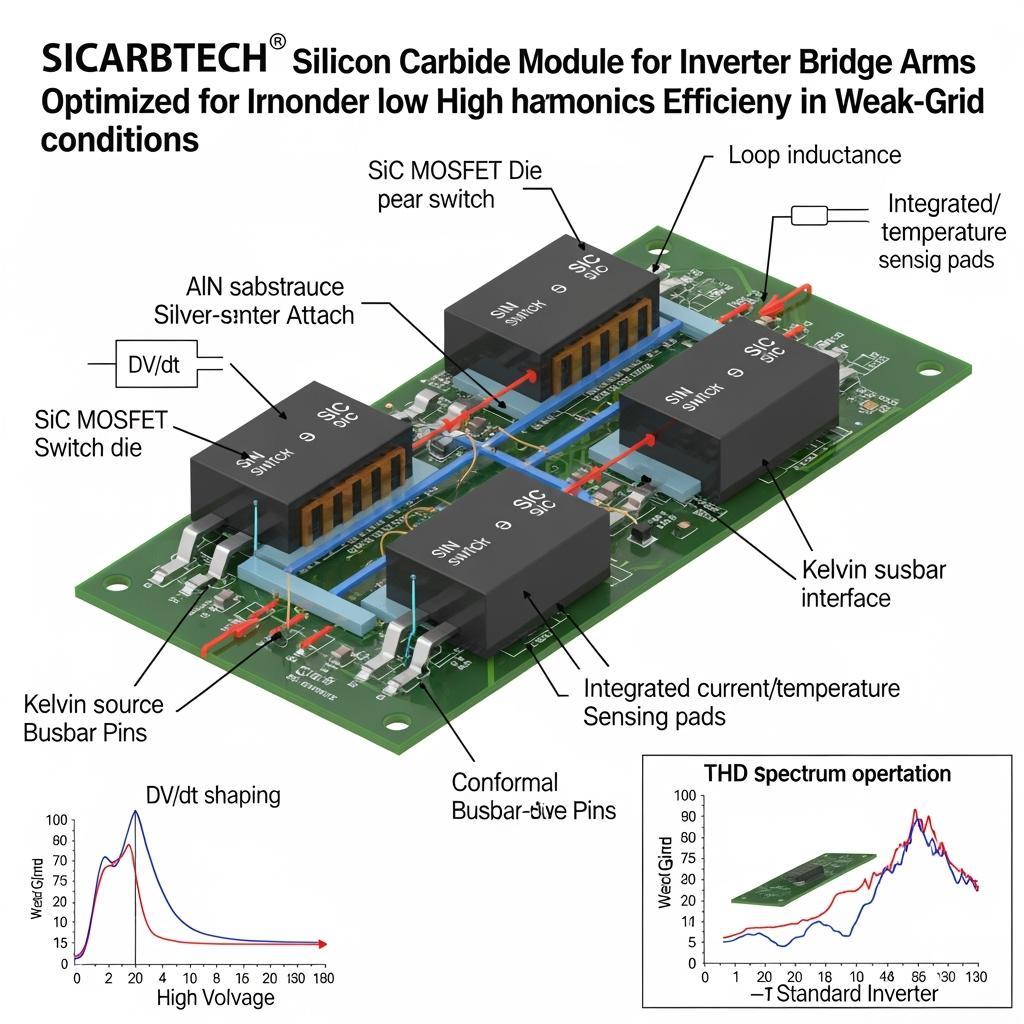 Zayıf Şebeke Koşullarında Düşük Harmonik ve Yüksek Verimlilik için Optimize Edilmiş İnverter Köprü Kollarında Kullanılan Silisyum Karbür Modüllerinin özü, komütasyon yollarını fiziğin izin verdiği kadar yakınlaştıran, sahada kanıtlanmış bir geometridir. Sicarbtech, düşük termal direnç ve sağlam güç döngüsü ömrü için alüminyum nitrür alt tabakalar üzerinde gümüş sinterleme kalıp bağlantısı kullanır. Köprü kolu düzeni, akım döngülerinin kompakt, çınlamanın sönümlenmiş ve anahtarlama kenarlarının tekrarlanabilir olması için doğal olarak istiflenmiş DC bara çubuklarına bağlanır; bu, zayıf şebekelerde öngörülebilir dijital akım kontrolünün anahtarıdır. Kelvin kaynak pimleri, güç ve kapı dönüşlerini ayırarak desat davranışını stabilize eder ve yanlış tetikleme olmadan hassas dv/dt ayarını sağlar.