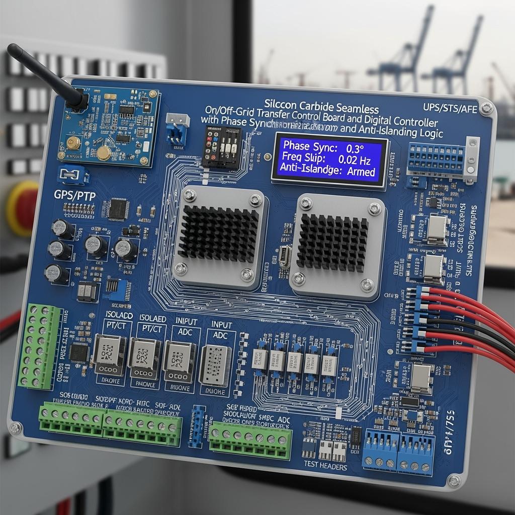 Silisyum Karbür Kesintisiz Açma/Kapama-Şebeke Transfer Kontrol Kartı ve Faz Senkronizasyonu ve Anti-Adalandırma Mantığına Sahip Dijital Kontrol Cihazı, deterministik, düşük gecikmeli karar verme için tasarlanmıştır. Genellikle yüksek performanslı bir DSP'nin bir FPGA dokusuyla eşleştirildiği yedekli dijital çekirdekler, izole PT/CT girişleri aracılığıyla gerilim ve akımı 10 µs'nin altında aralıklarla örnekler. Dijital bir faz kilitli döngü, şebeke açısının, frekansının ve frekans değişim oranının (RoCoF) sürekli tahminlerini korurken, model tabanlı bir gözlemci, optimum transfer anlarını tahmin eder. Kartın fiber izole bağlantıları, SiC aktif ön uçlarını, UPS invertörlerini ve statik transfer anahtarını koordine eder, böylece tam geçiş noktasını şans değil, güç elektroniği belirler.