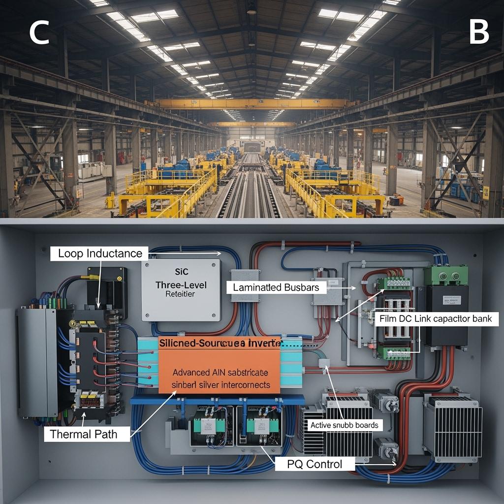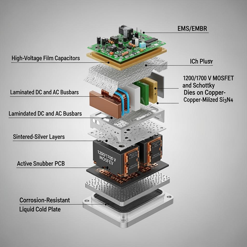 - Packaging co‑design: sintered‑silver die attach and topside interconnects; copper‑metallized AlN/Si3N4 substrate selection; laminated DC/AC busbar geometry targeting <10 nH loops; DC link and active snubber tuning for high edge rates and parallel operation with circulating‑current suppression.