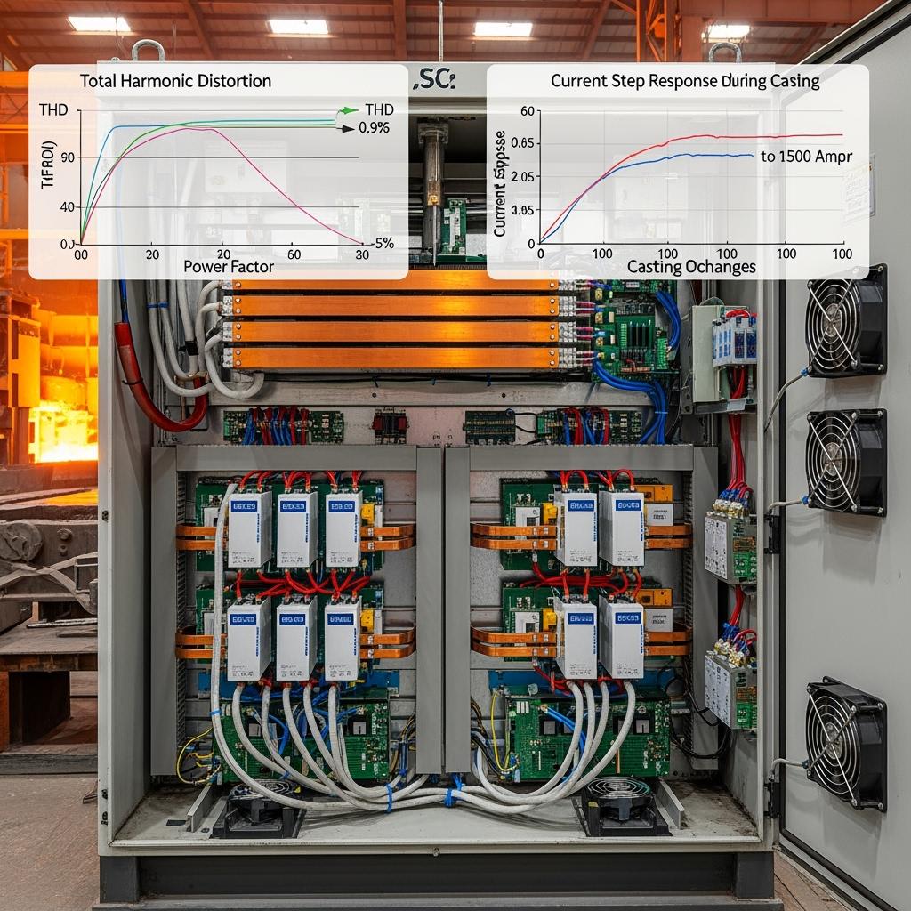 In 2025, the business case for SiC in continuous casting is clear: energy savings, tighter current control, and cleaner interconnection. By operating at higher switching frequencies with low conduction and switching losses, SiC power stages shrink magnetics and filters while preserving thermal margin in 40–50°C mill environments. Field‑ready configurations reach 98.5–99.0% peak efficiency on rectifier/inverter links; typical system gains are 0.8–1.5 percentage points. With laminated busbars and <10 nH loop inductance, EMS/EMBr supplies achieve ≤3% THD and near‑unity power factor, reducing transformer stress and tariff penalties. Fast current loops—to the sub‑millisecond domain—stabilize flow fields through casting speed changes and grade transitions, improving slab and billet quality.