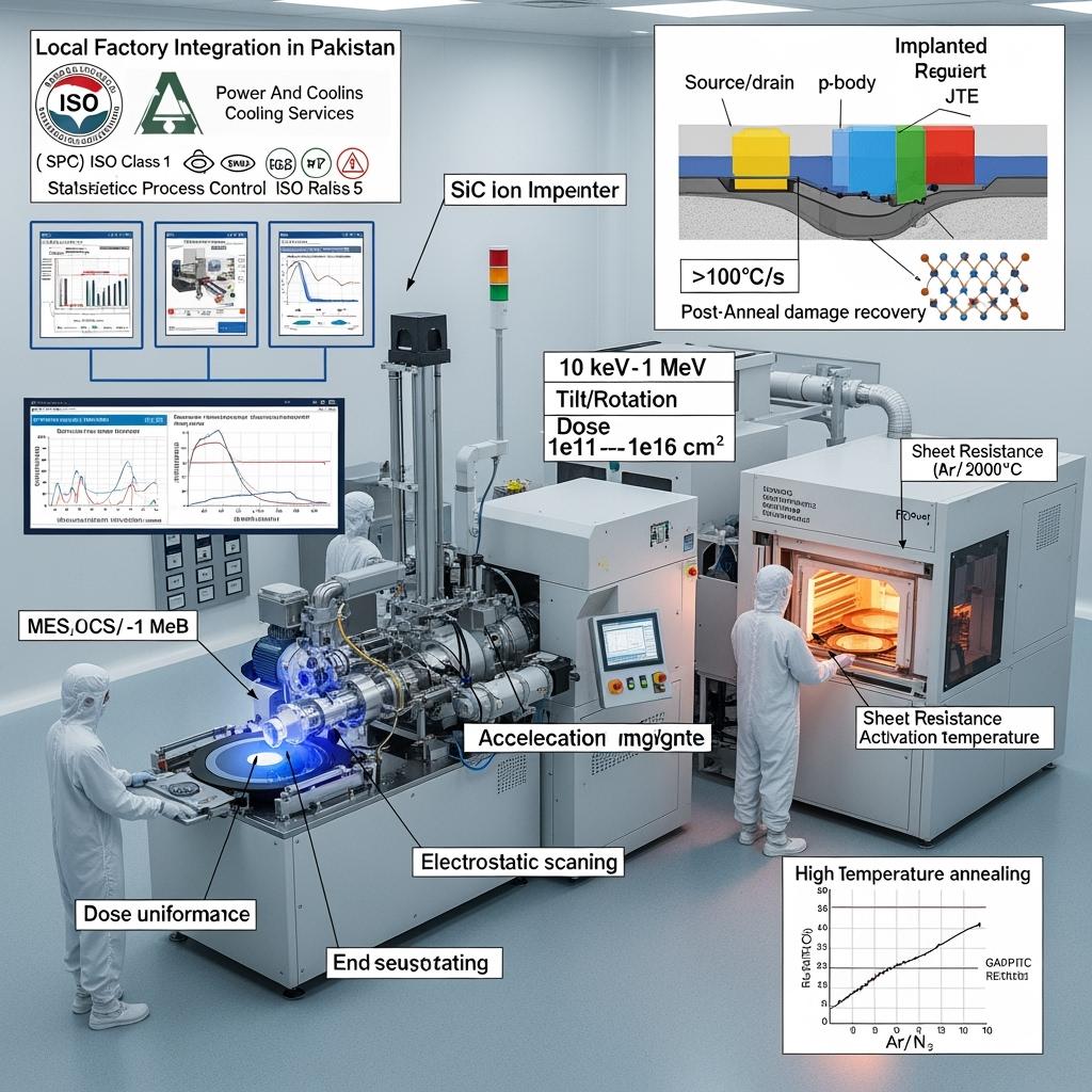 Pakistan'ın endüstriyel pazarı için, SiC'nin malzeme avantajlarını saha sonuçlarına dönüştürmek, gofrette başlar. Hassas iyon implantasyonu ve sağlam yüksek sıcaklık aktivasyonu, daha düşük kayıplara, daha sıkı arızaya ve daha güçlü güvenilirliğe sahip cihazlar sağlar. Bu da sırayla, ≥ PCS verimliliği, daha küçük soğutma ve filtreler, daha hızlı MV bağlantı onayı ve 45–50°C'lik, tozlu ortamlarda sürekli çalışma süresi sağlar. Bu araçlara yatırım yapmak veya bunlara sahip bir sağlayıcıyla ortaklık kurmak, doğrudan yatırım getirisini iyileştirir ve pazara girişi hızlandırır.